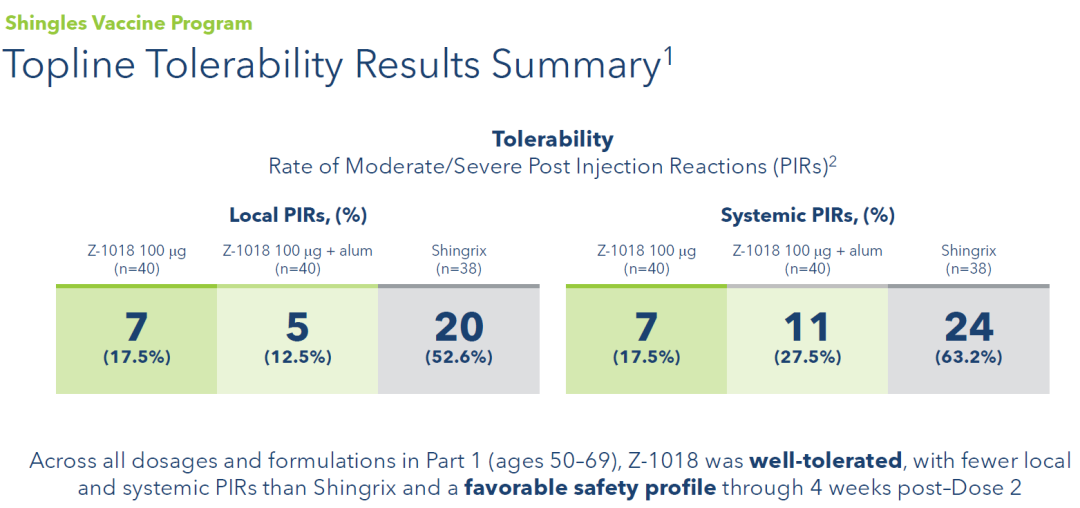 由于采用CpG-1018佐剂,Z-1018的耐受性显著优于Shingrix。