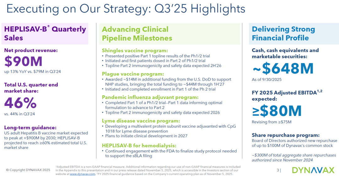 Dynavax经营状况良好,截至2025年三季度末账上现金6.48亿美元。