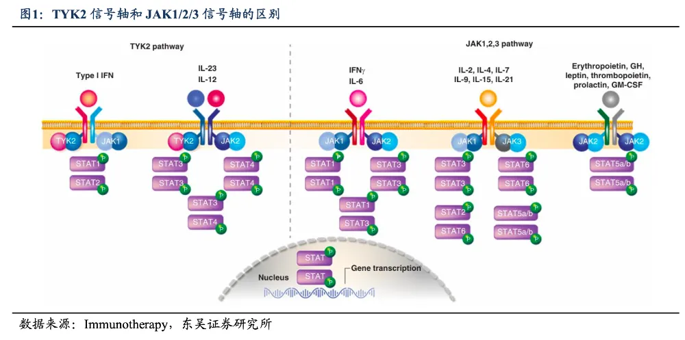 谈及TYK2,我们不得不提及JAK家族。TYK2作为JAK家族的一员,因早期发现时并未明确JAK家族的概念,故未采用JAK的命名方式,从而在家族中显得独特。