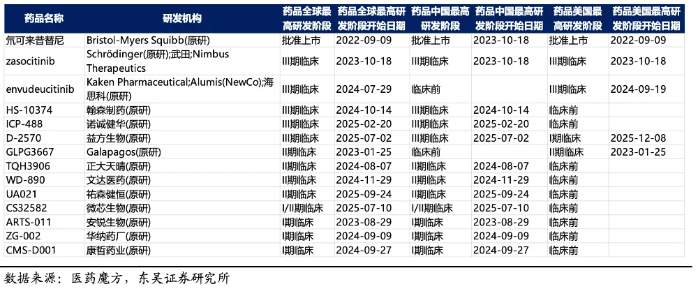 即便如此,TYK2作为自免口服赛道的重要靶点,全球药企对其探索从未停歇。纵观TYK2研发管线全局,仍有30多款相关药物已挺进临床阶段。