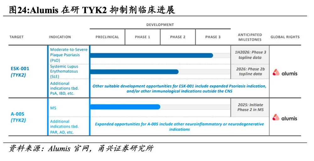 进度靠前的还有Alumis旗下TYK2变构抑制剂ESK-001,目前进展较快的适应症主要是PsO和SLE。