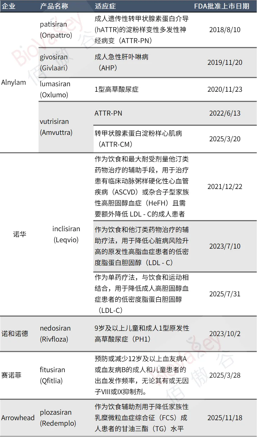 回顾RNAi的监管历程,从2018年8月首款siRNA药物patisiran(Onpattro)获得FDA批准,打破了RNAi技术在递送难题凸显和资本相继退出的黑暗时期,到如今2025年,7年多的时间,已经有8款siRNA新药获得监管批准——siRNA药物已经成为创新药中重要的组成部分,给多种亟待治疗选择的患者提供了治疗机会。
