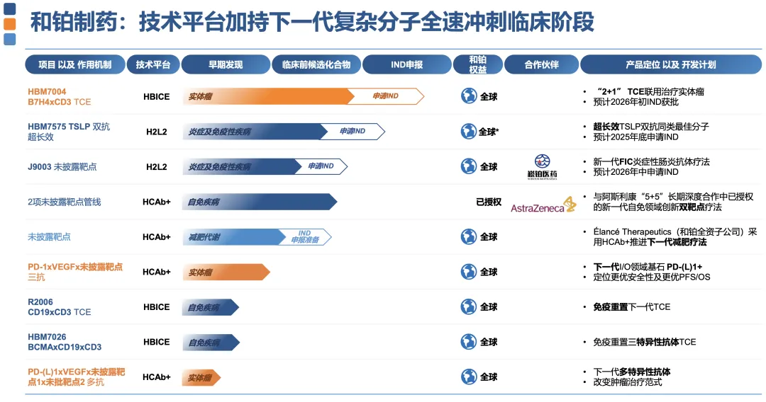 即将迎来第一个商业化产品,巴托利单抗(HBM9161)是首个在中国完成临床I期至关键性临床试验的抗FcRn单克隆抗体,有望成为针对多种自身免疫性疾病的重磅疗法;长效TSLP单抗HBM9378为潜在同类最佳,在TSLP单抗乃至所有针对哮喘的生物制剂中在给药间隔方面具有独特优势,哮喘全球II期POLARIS临床试验今年7月启动,初步数据预计2026年中期公布;超长效下一代靶向TSLP双抗分子HBM7575正在加速向IND推进;R2006(CD19xCD3)与HBM7026(BCMAxCD19xCD3)是针对多种自身免疫疾病下一代TCE,具有安全性更高、免疫原性和细胞因子风暴风险更低的特点;HBM7020(BCMA×CD3)可有效清除表达BCMA 靶点的细胞,在自身免疫疾病领域具有巨大潜力,预计今年内启动海外临床I期试验。