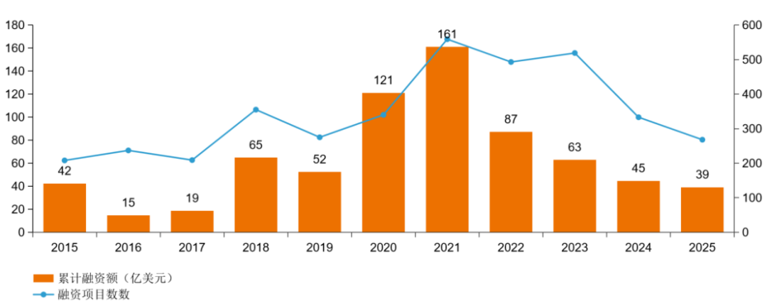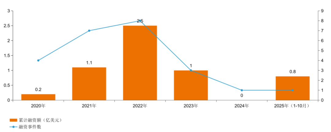 2025年,国内CXO行业一二级市场呈现出不同的面貌。2025年1-10月,国内CXO领域共39起融资,累计融资额超3.4亿美元,自2021年以来持续走低,也与国内创新药融资趋势一致。