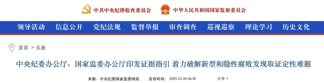 近日,中央纪委办公厅、国家监委办公厅印发《调查新型腐败和隐性腐败问题证据指引》(以下简称《证据指引》),针对近年来出现的新型腐败和隐性腐败问题,立足法定证据标准,完善取证思路、明确取证重点,着力破解新型腐败和隐性腐败发现、取证、定性难题,让新型不“新”、隐性难“隐”,不断提升调查取证工作规范化、法治化、正规化水平。