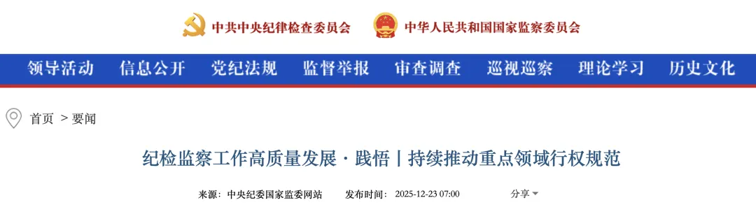 近日,中纪委发布《纪检监察工作高质量发展·践悟丨持续推动重点领域行权规范》文章。