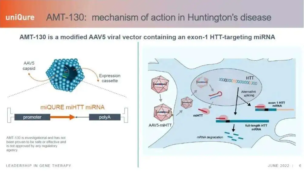 AMT-130基于uniQure 专利miQURE基因沉默技术开发,采用AAV5为载体,将靶向亨廷顿基因的人工micro-RNA送至脑组织,通过抑制mHTT产生,实现对疾病根源的精准干预。该药预计于2026年提交BLA,若能顺利获批,则有望成为全球首个针对HD治疗的基因疗法。