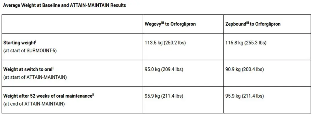 具体数据来看,在预先设定的52周分析中,从Wegovy换为orforglipron的受试者能够维持先前达到的体重减轻效果,平均差值为0.9 kg;从Zepbound换为orforglipron的受试者能够维持先前达到的体重减轻效果,平均差值为5.0 kg。