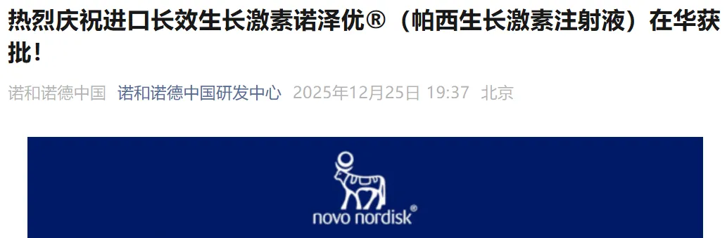2025年12月25日,诺和诺德宣布,其创新长效生长激素——帕西生长激素注射液(商品名:诺泽优®,通用名:Somapacitan)正式获得中国国家药品监督管理局批准,用于治疗因内源性生长激素分泌不足而导致生长缓慢的2.5岁及以上儿童患者。