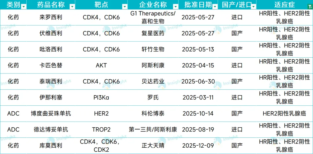 乳腺癌新药中,1 款用于治疗 HER2 阳性乳腺癌,为科伦博泰的博度曲妥珠单抗,这也是首个覆盖 HER2 阳性乳腺癌适应症二线及以上全人群的国产 HER2 ADC;其余 8 款用于治疗 HR 阳性、HER2 阴性乳腺癌,其中包括 4 款 CDK4/6 抑制剂,分别是吡洛西利(轩竹生物)、来罗西利(嘉和生物)、伏维西利(复星医药)和泰瑞西利(贝达药业),前三款均已被纳入新版医保目录。