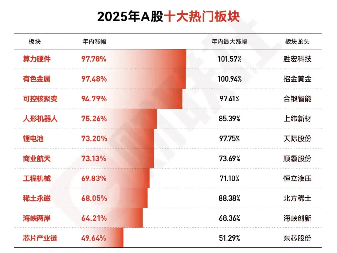 2025年最大的主线当然是AI,由英伟达带动的两大上游产业:光模块CPO和印刷线路板PCB,分别诞生了“易中天”和胜宏科技这样的大牛股。全球AI竞争对上游算力和能源的需求是巨大的,捎带着储能、可控核聚变等概念也火热。