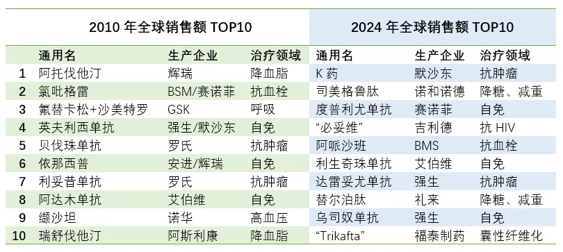 如今的状况和那时候有点类似。2026年,全球TOP10的药品中至少有4个专利到期:抗凝药阿哌沙班,自免药物度普利尤单抗和乌司奴单抗,减肥药司美格鲁肽。算上很快就要到期的K药,全球药品热榜又要重排一遍。