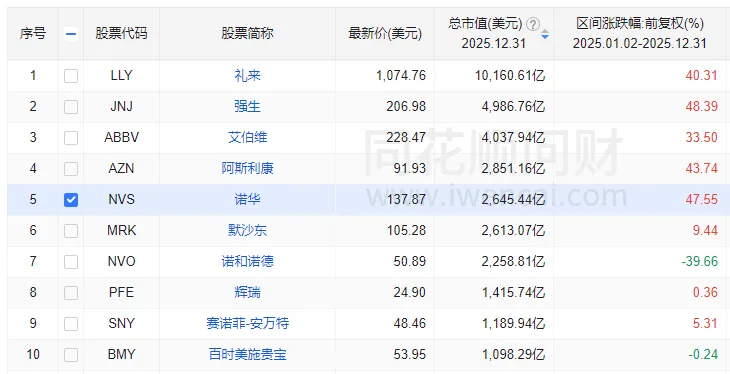 全球制药巨头市值TOP10 2025年股价涨幅