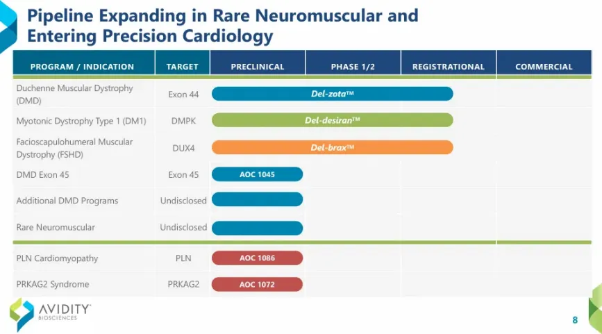 Avidity在研管线中开发进度最快的是Del-zota(AOC 1044)、Del desiran、Del-brax,针对杜氏肌营养不良症(DMD)、1型强直性肌营养不良症(DM1)和面肩肱型肌营养不良症(FSHD)等适应症。其中,AOC 1044对于DMD治疗领域具有里程碑意义,有望于2026年获FDA批准上市,成为首款上市的AOC药物。
