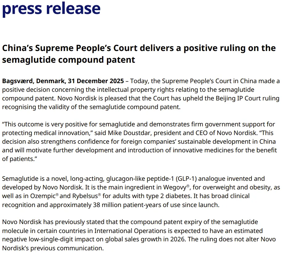 2025年12月31日,诺和诺德宣布中国最高人民法院就司美格鲁肽化合物专利案做出积极决定,支持北京知识产权法院支持司美格鲁肽化合物专利有效的裁定。