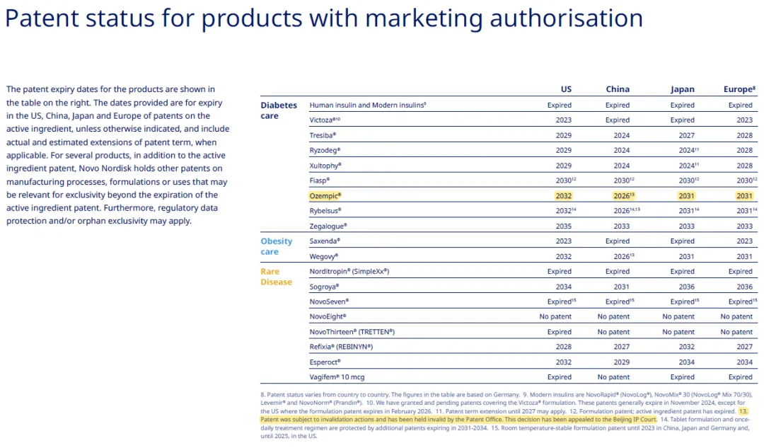 司美格鲁肽在美国的专利于2032年到期,欧洲专利于2031年到期,中国的专利于2026年到期。