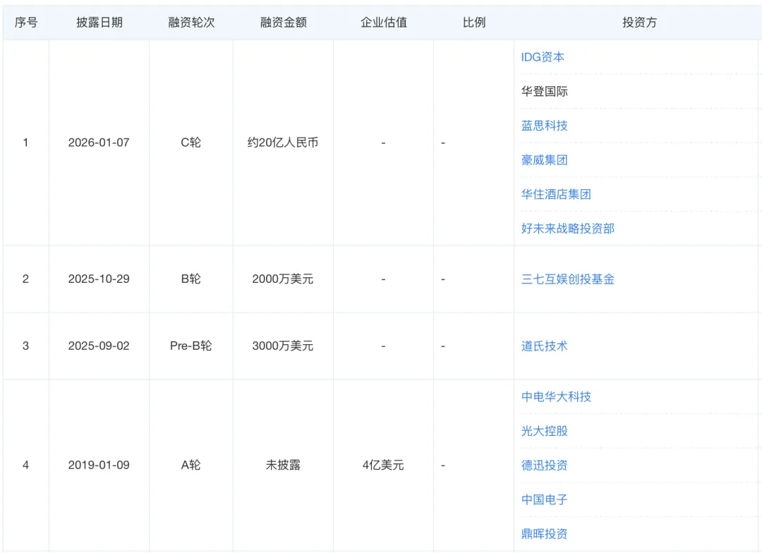 公开信息显示,本轮融资投资人阵容覆盖财务投资方、产业资本与战略投资方,包括 IDG、由英特尔 CEO 陈立武创立的华登国际,以及蓝思科技、领益智造等产业链企业,同时还包括韦尔股份、润泽科技、华住集团、好未来集团等战略投资方,另有来自中国香港及美国的家族办公室参与。