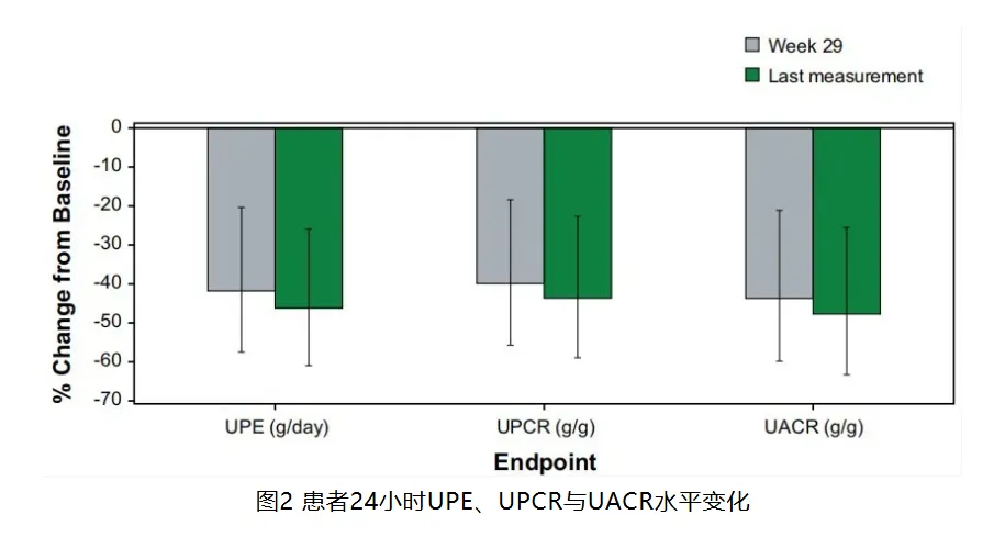 ● 24小时UPE较基线降低43%(几何平均值从2.5g/d降至1.4g/d),其次尿蛋白/肌酐比值(UPCR)和尿白蛋白/肌酐比值(UACR)降幅分别为40%和44%;