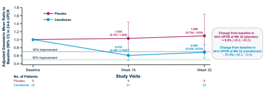 在第32周时治疗组24h-UPCR较基线下降31.4%,较安慰组下降37.4%;另外,治疗组77.2%患者观察到血尿减少,安慰剂组22.2%。