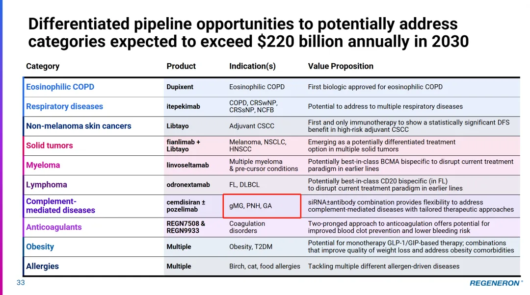再生元的Cemdisiran是一款靶向补体C5的siRNA疗法,C5是补体经典激活通路的一个关键蛋白,围绕这一关键蛋白研发的分子已非常广泛,包括重磅炸弹依库珠单抗、拉武利珠单抗等。