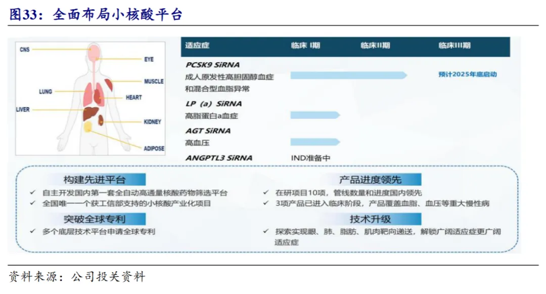 石药集团依托GalNAc肝脏靶向递送技术和全序列化学修饰策略显著延长基因沉默作用时间搭建了自研的小核酸技术平台,除了PCSK9、AGT、Lp(a)靶点外,靶向C5的siRNA管线SYH2061也在2025年11月进入临床,临床前研究显示SYH2061药效持续性较同类产品提升40%以上,有望将给药频率降低至数月一次。