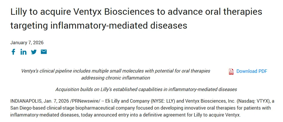1月7日,礼来宣布已与Ventyx Biosciences达成收购协议,将以每股14美元的价格收购后者所有流通股,总交易额约为12亿美元。成交时支付的购买价格较Ventyx普通股截至2026年1月5日结束的30天成交量加权平均交易价多出约62%的溢价。
