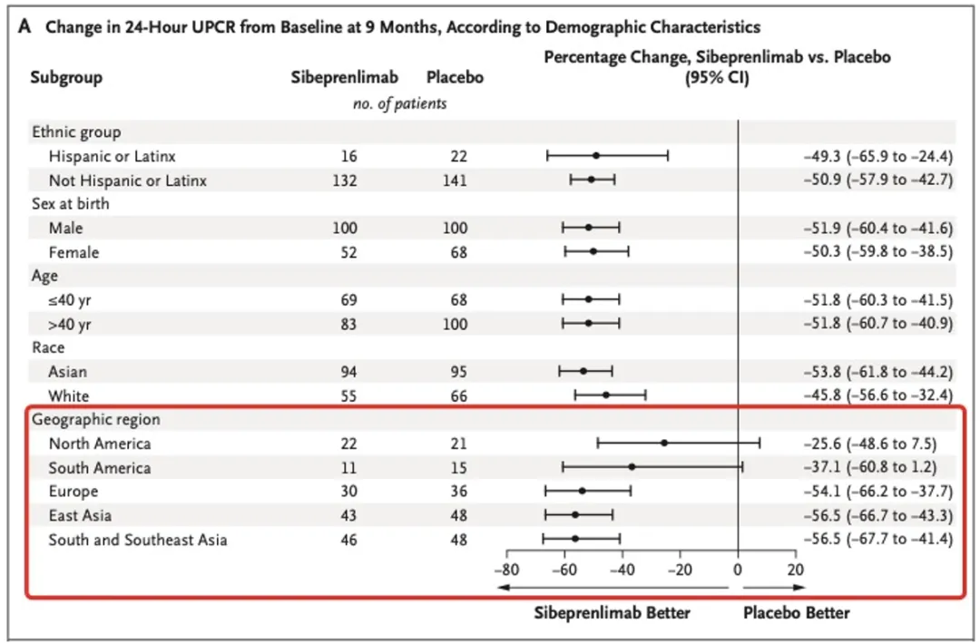 比如,全球首个对因治疗IgA肾病的药物Nefecon(布地奈德),Ⅲ期临床研究NefIgArd的A部分显示,治疗9个月后,北美亚组蛋白尿减少24%,明显低于欧洲亚组的35%。