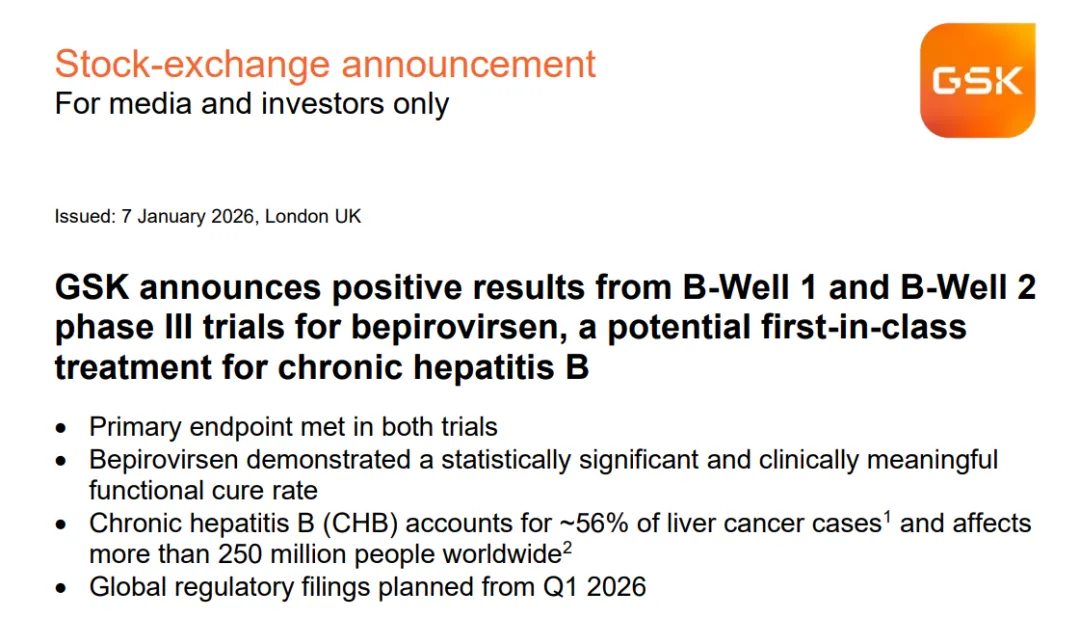 2026年1月7日,葛兰素史克(GSK)宣布,其在研慢性乙型肝炎(CHB)治疗药物bepirovirsen的两项关键III期临床试验B-Well 1与B-Well 2,均达到主要研究终点。该研究结果显示,bepirovirsen联合现有标准疗法,相比单独使用标准疗法,实现了具有统计学显著性与临床意义的功能性治愈率。