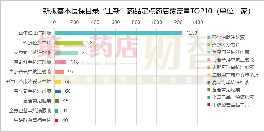 先看此次基本医保目录“上新”药品的结构,其中,替尔泊肽注射液一骑绝尘,已有1253家定点药店有过销售记录,远超后面的药品。流感创新药玛舒拉沙韦片排名第二,治疗干眼症的创新药全氟己基辛烷滴眼液亦榜上有名。