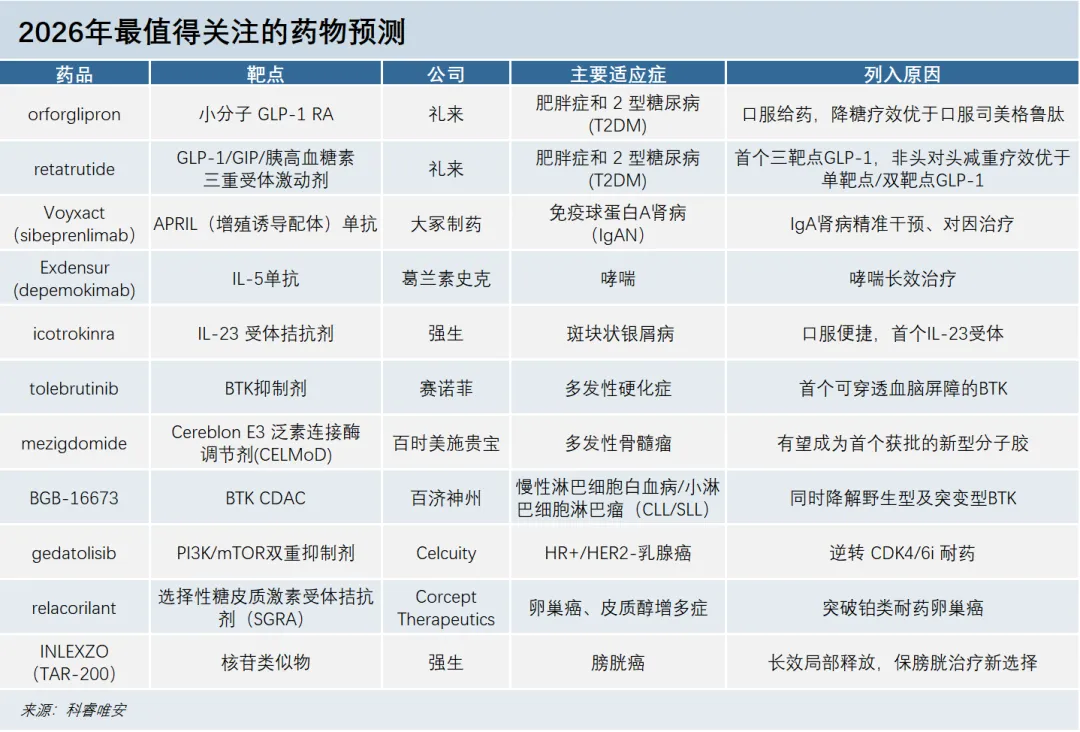 近期,科睿唯安发布了报告《2026年最值得关注的药物预测》。入选的11款药物均是科睿唯安认为五年内有望成为重磅炸弹药物或显著改变治疗方式的疗法,如礼来两款GLP-1产品、获得FDA加速批准的IgA肾病药Voyxact、新型分子胶药物mexigdomide等。(见下图)