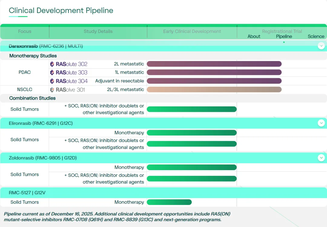 Revolution计划在2026年启动更多全球3期试验,包括Daraxonrasib单药及联合吉西他滨+白蛋白紫杉醇(GnP)对比GnP一线治疗转移性PDAC,以及Daraxonrasib 联合帕博利珠单抗及化疗一线治疗RAS突变转移性NSCLC。