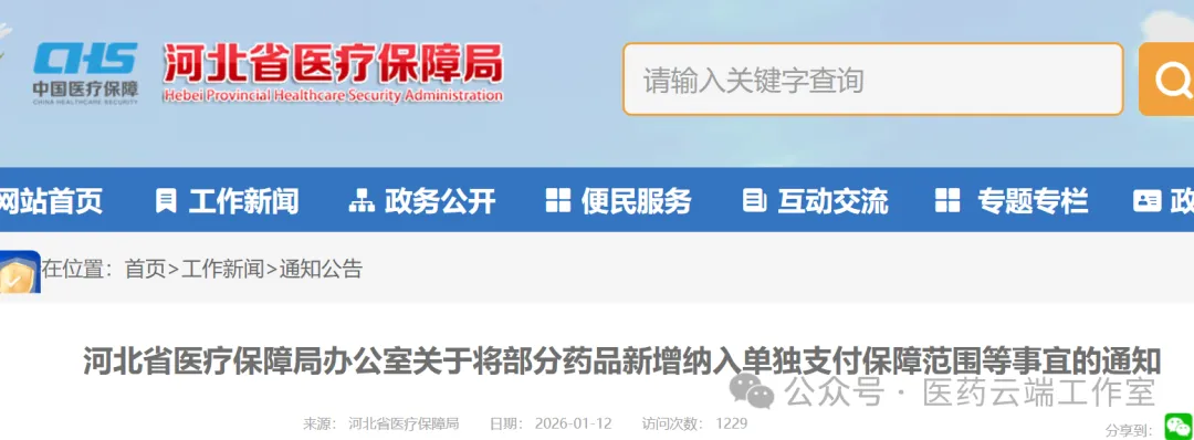 1月12日,河北省医保局发出《办公室关于将部分药品新增纳入单独支付保障范围等事宜的通知》,该通知自2026年1月1日起实行。