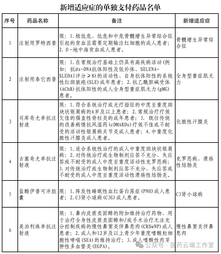 此外,部分原已纳入单独支付保障范围的药品,此次国家新版药品目录中增加了新的适应症,将新增适应症(6个)同步纳入单独支付保障范围(附件2)。