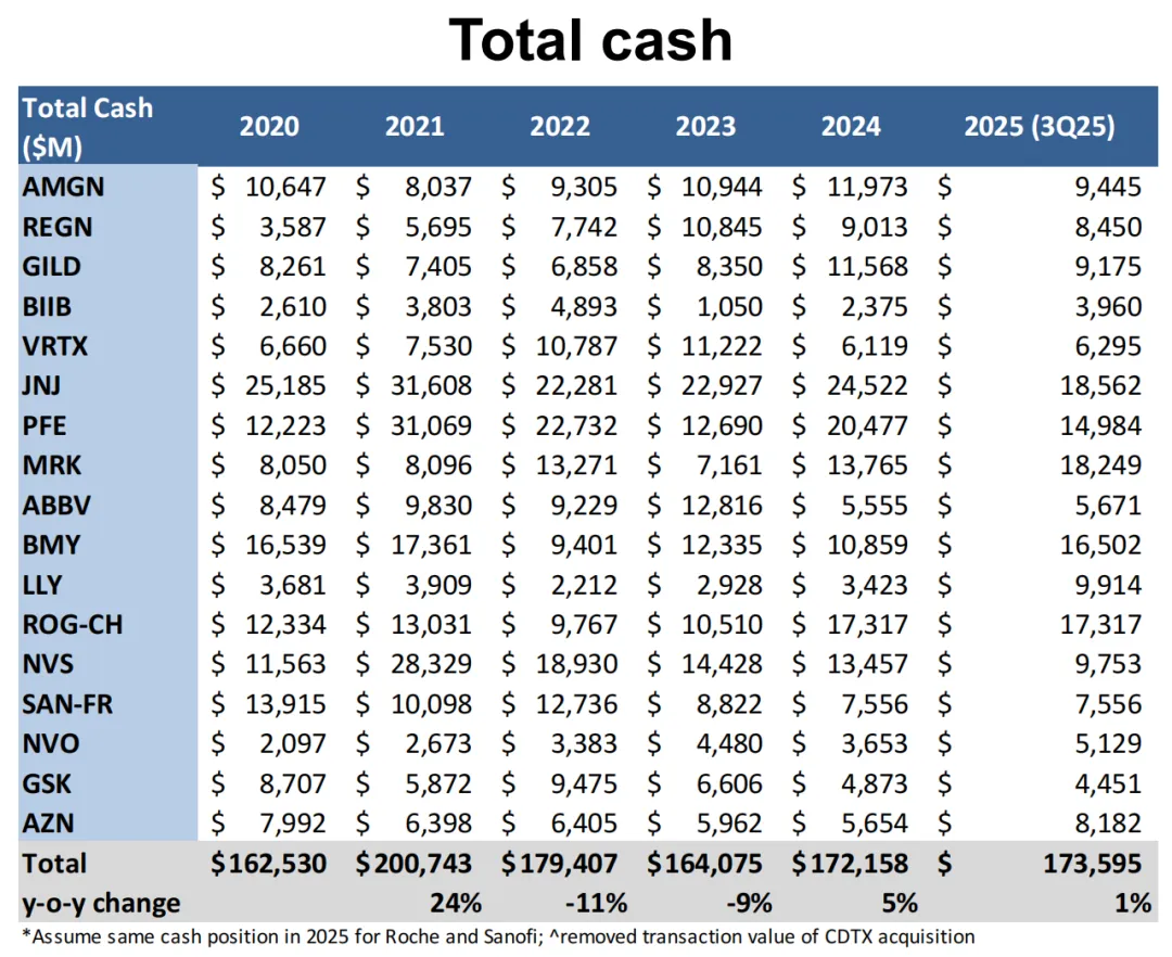 从各大MNC 2025Q3财报所呈现的购买力来看,巨额并购不存在购买力受限的问题,19家大型制药公司现金储备总额超过1700亿美元;再从自由现金流的角度,2025年前三季度产生了约1400亿美元的自由现金流,假设按行业保守的2.5倍杠杆计算,足以容纳数量不少的大规模并购交易。