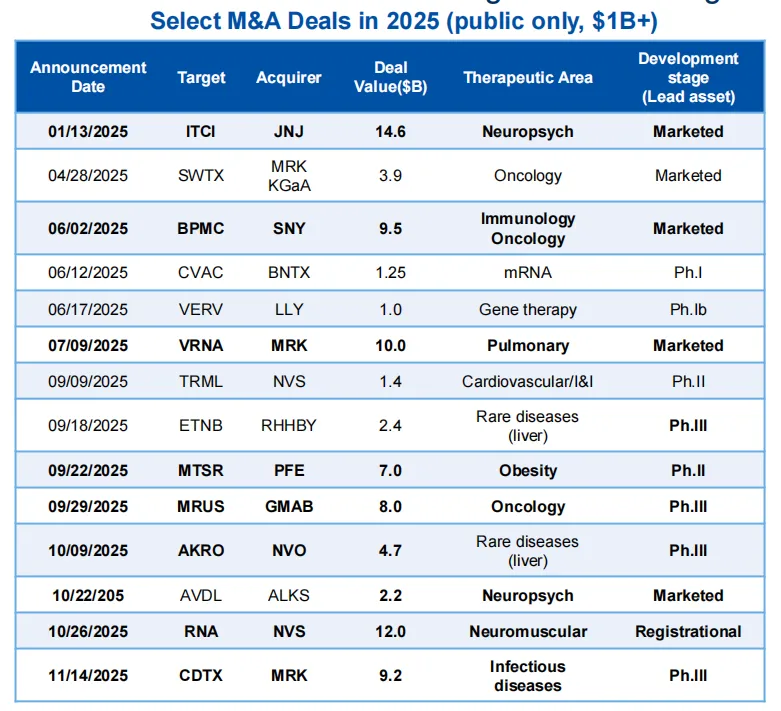另外2025年发生的超过10亿美元并购交易有着升温态势,超过10亿美元的交易中有超过70%资产集中在临床三期和注册性商业化资产;微观上,Cidara Therapeutics、Akero Therapeutics两家被并购的Biotech交易呈现多方激烈竞价也呈现出MNC对优质后期资产的渴求。