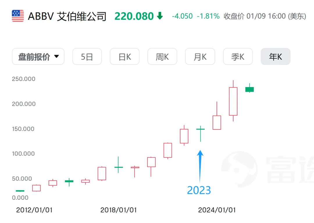 前一代“药王”修美乐的专利在2023年到期,可以看到艾伯维仅仅在专利到期当年股价没有上涨,2024年、2025年都呈现了较好的涨幅。