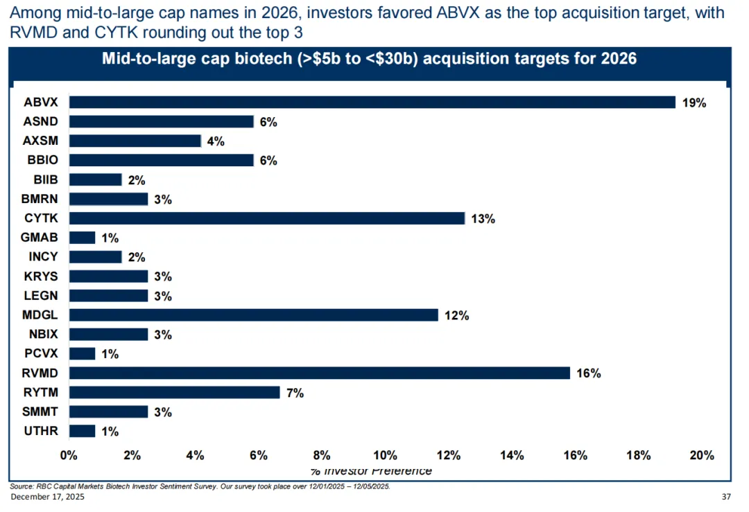 据加拿大皇家银行调查统计,海外机构投资认为Abivax、Revolution、Cytokinetics、Madrigal是前4大可能被收购的中大型对象。