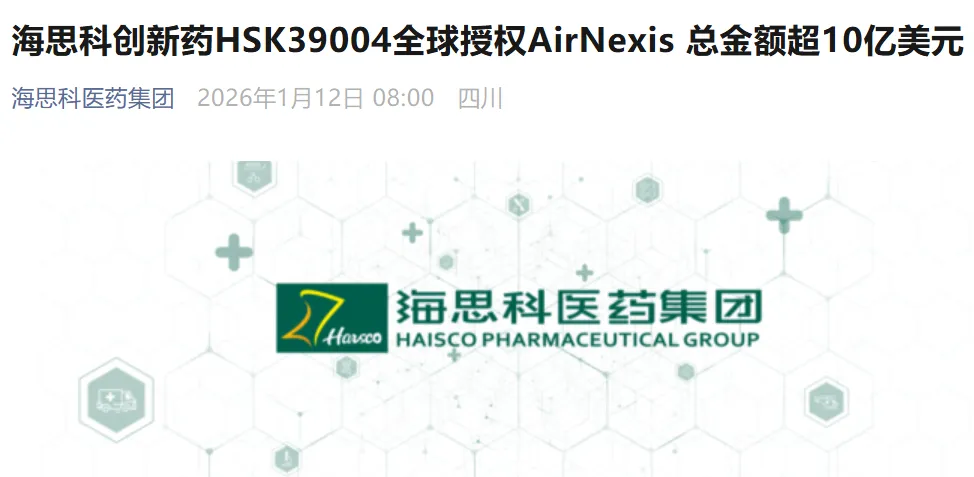 1月9日,海思科医药集团宣布与美国生物制药新锐AirNexis达成独家许可协议,将其自主研发的1类创新药HSK39004在中国大陆及港澳台以外全球市场的开发、生产及商业化权利成功授权。这笔交易潜在总金额高达10.63亿美元,其中包含1.08亿美元首付款及最高9.55亿美元的里程碑付款。这不仅是一笔高价值的License-out交易,更因其独特的合作模式与产品在呼吸系统疾病领域的突破性潜力,成为中国创新药国际化进程中的一个标志性事件。