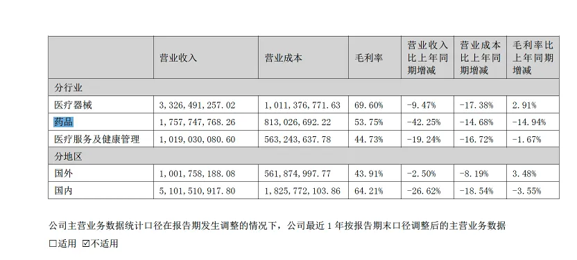 乐普医疗的主营业务有三大板块,以仿制药为主的药品收入在下降,在总收入的占比从2021年的42.44%,下滑到2024年的28.8%。