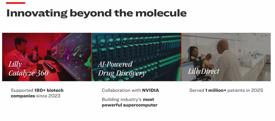 公司展示了其超越药物开发的创新:1月12日,礼来与英伟达合作建设行业领先的超级计算机以加速研发;通过风险投资支持超过180家生物科技公司,构建外部创新网络;以及直接服务患者,在2025年服务患者超过100万人。