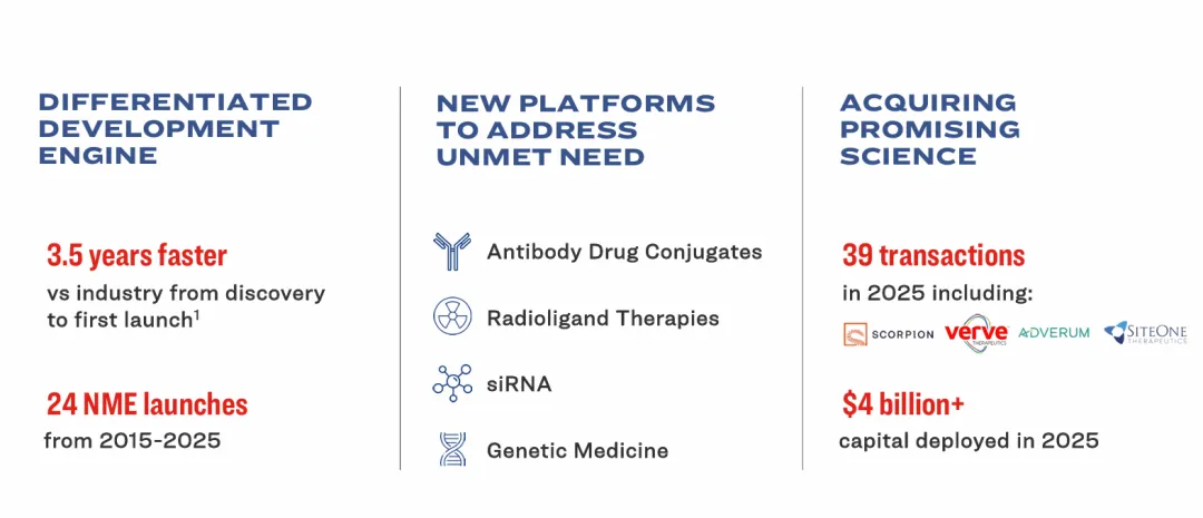 在研发层面,礼来正快速推进抗体偶联药物、放射性配体疗法、siRNA和基因治疗等新平台,并通过积极的并购(2025年完成39项交易,部署超40亿美元资本)将前沿科学快速纳入自身体系,旨在从药物发现、开发到患者支持的整个价值链建立竞争优势。