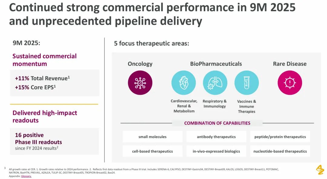 阿斯利康在其展示中重申了“到2030年实现800亿美元总收入”的雄心。公司2025年前九个月表现强劲,总收入增长11%,核心每股收益增长15%。其战略核心在于五大重点治疗领域(肿瘤、心血管、肾脏与代谢、呼吸与免疫、疫苗与免疫疗法)的均衡发展,并通过全球布局与多元化业务来源支撑增长。