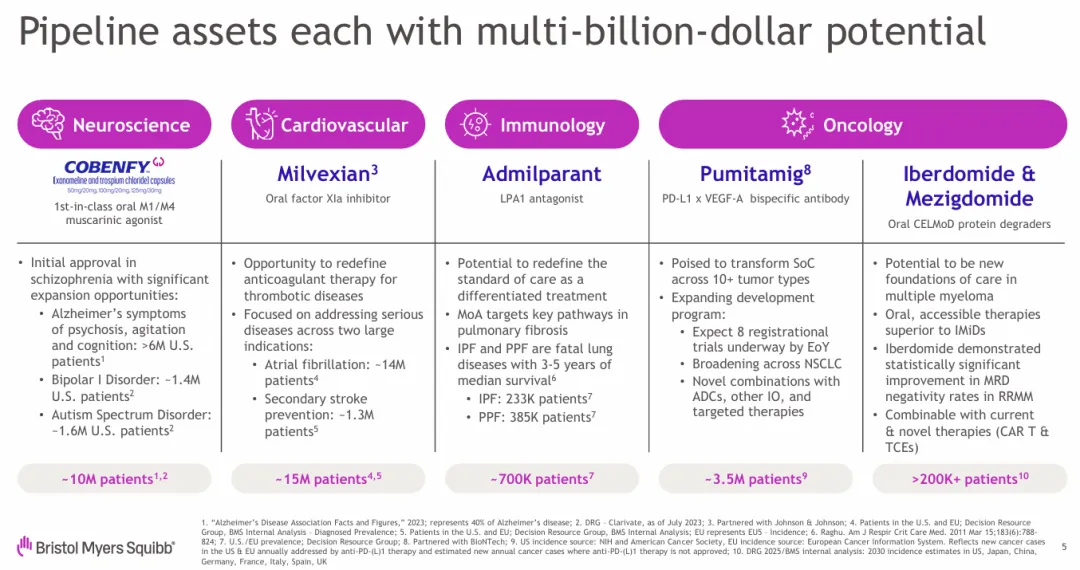 BMS着重介绍了其具有数十亿美元潜力的管线资产,包括神经科学领域的Cobenfy(KarXT)、心血管领域的milvexian、免疫领域的admilparant、肿瘤领域的pumitamig(PD-L1