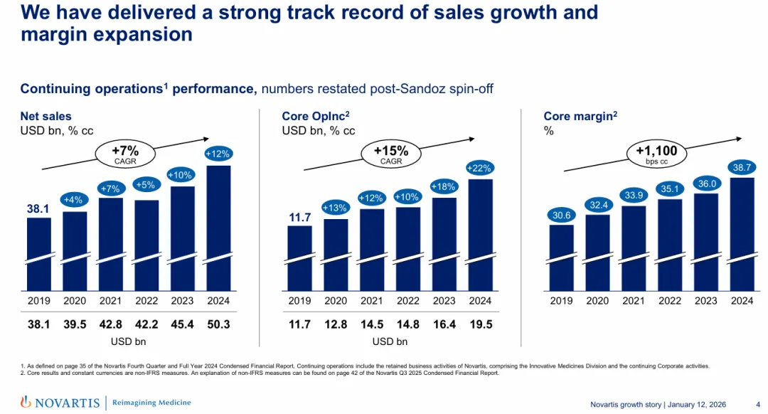 诺华首席执行官Vas Narasimhan展示了公司在剥离山德士后的强劲增长轨迹。公司战略聚焦于心血管-肾脏-代谢、免疫学、神经科学和肿瘤学四大核心治疗领域,以及化学、生物治疗、xRNA、放射性配体疗法和基因与细胞疗法五大技术平台。公司预计2025-2030年销售额复合年增长率(CER)为5-6%,并在2029年将核心利润率恢复至40%以上。