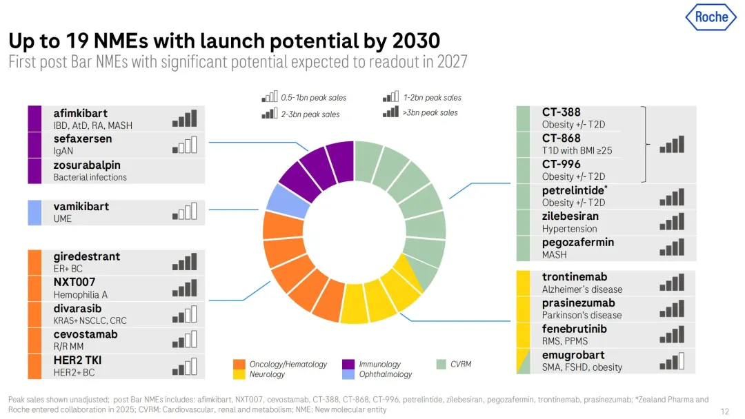 骨干。在神经科学领域,fenebrutinib作为唯一在复发型和原发进展型多发性硬化症三期试验中取得阳性结果的BTK抑制剂,备受关注。此外,罗氏明确表达了在肥胖症领域成为TOP3玩家的决心,预计2026年将公布五款新分子实体的三期启用数据。
