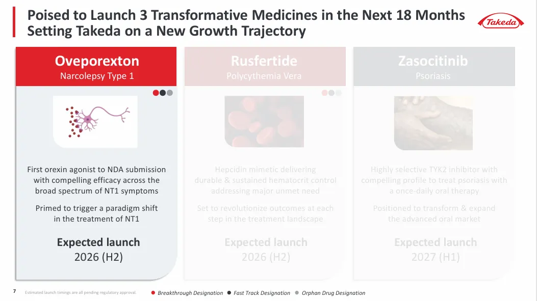 武田将其发展周期划分为两个阶段:FY2021-2025是管理专利悬崖、聚焦研发和建设数字化能力的“蓄力期”;而FY2026-2030+则是凭借变革性后期管线驱动增长的“收获期”。公司明确指出,未来18个月内有望上市的三款新药——用于发作性睡病1型的orexin受体2激动剂TAK-994、用于真性红细胞增多症的hepcidin模拟物rusfertide、以及用于银屑病的高选择性TYK2抑制剂zasocitinib——将把公司带入全新的增长轨道。