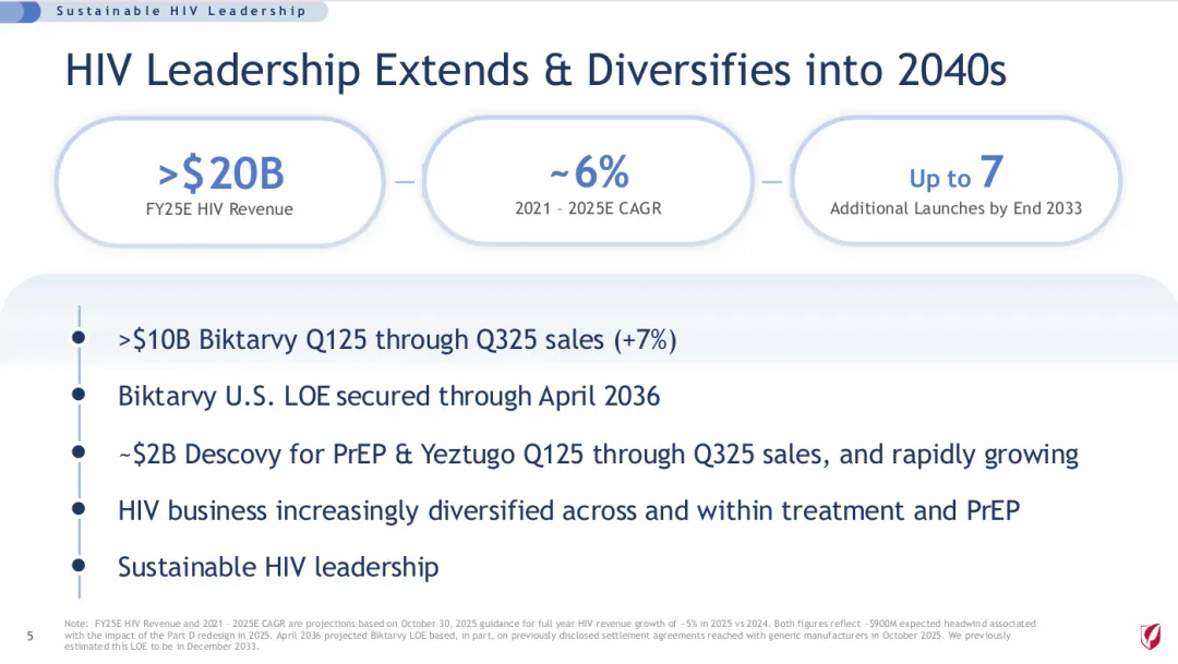 吉利德的核心信息围绕三大支柱展开:延续至2040年代的HIV治疗与预防领导地位、公司历史上最强劲的临床与上市管线,以及对运营开支和并购的积极主动且 disciplined 的策略。其HIV业务预计2025年收入将超过200亿美元,比卡替拉韦/恩曲他滨/丙酚替诺福韦(Biktarvy)市场地位稳固,而长效注射剂Yeztugo(lenacapavir)用于HIV暴露前预防(PrEP)的上市正开辟全新格局。