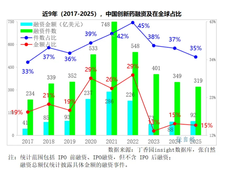 2025年,我国创新药融资金额有所复苏(包含IPO前融资、IPO融资,但不含IPO后融资),共融资92亿美元,同比增长4.5%,占全球创新药领域融资总额(618亿美元)的15%,占比与2024年的持平,高于2023年的13%。(详见下图)