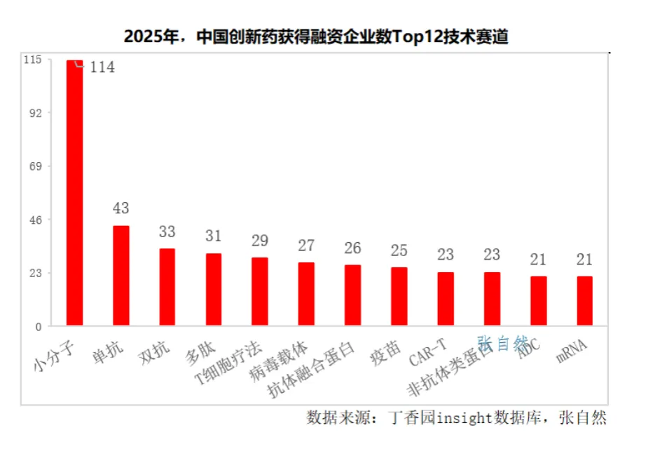 在2025年我国319起创新药领域融资事件中,小分子领域获得融资的企业数最多,有114家;