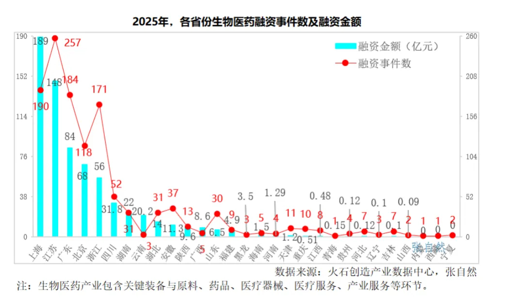 2025年生物医药产业融资主要集中在经济发达的少数几个沿海省份,融资金额方面,上海第一(189亿元,占28%),江苏第二(148亿元,占22%),两省份合计占了全国的一半;融资事件数方面,江苏第一(257起,占21%)、上海第二(190起,占16%),两省份合计占37%。